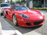 ![]() | PORSCHE Carrera GT (2004-2006) (Beverly Hills, CA / February 20, 2006) - With a price tag of $440,000, the Carrera GT is a rare sight even in Beverly Hills. Its 5.7L V10 takes it from 0-60 mph in under 3.5 seconds and can reach a top speed of over 210 mph with a unique sound almost incomparable to any other street car. After speeding around the Golden Triangle for a few minutes, the owner finally found a parking spot, and left the car with its roof off and windows down. I was the first spectator at the scene, followed by a photographer who abandoned his task of shooting the front of a store in favor of the Porsche. A large crowd soon formed, with some people who recognized the car as exotic and others who simply admired its red paint and sleek design. |