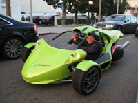 ![]() | CAMPAGNA T-Rex (????) (Beverly Hills, CA / December 8, 2007) - Even to people who think all cars look the same, this one is sure to catch their attention. Built in Quebec, Canada, the T-Rex combines technology from both cars and motorcycles to create a vehicle with incredible handling. Registered in the U.S. as a motorcycle, it uses a motorcycle engine to power a single wide rear wheel. This example is the most recent model, powered by a Kawasaki 1352 cc inline four. The seating position, steering wheel, and suspension are all derived from cars. The result is a vehicle that reaches 60 mph in under 4 seconds, has an unusually low center of gravity, and handles better than most 4-wheeled vehicles can. Despite all its good features, the T-Rex definitely isn't practical. It has no windshield or doors, and trunk space is next to nothing. And let's not forget that it costs nearly $50,000. But practicality isn't what buyers look for in a vehicle like this. T-Rex owners certainly have other vehicles to use as a daily driver, and if they are willing to put in the money, they can find themselves behind the drivers seat of a vehicle that delivers a unique driving experience no other car can give. Besides, even in places like Beverly Hills where Ferraris are an everyday sight, a ride like this is sure to make people whip out their cameras. |